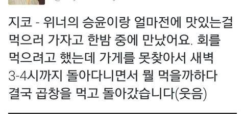 "Zico & Kang Seungyoon wanted to go eat something tasty together so they met during the night. they were planning to eat sashimi but they couldn't find any stores. they were hanging out until 3-4am and finally went to eat tripes (laugh)"