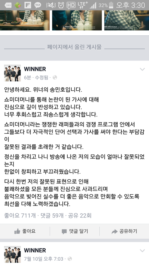 - T/n: Song Mino released his apology on Winner's official facebook page, because of his controversial lyrics. However, Korean mothers and doctors request a direct apology from him.