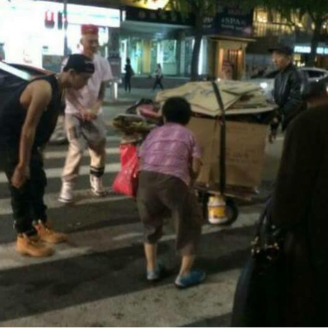 Bobby was ready to get on the car but went down, and he asked the ajummma who was pulling the cart if she needed help (t/n: you can see a lot of those ajummas in Korea, they usually recycle stuff and pick other people's waste to throw it away the carts are most of the time bigger than them and must be very heavy :/).