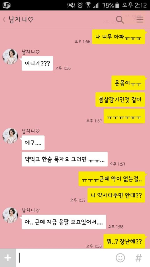 Y: ㅠㅠㅠ but I have no medocs.. can't you go buy some for me??