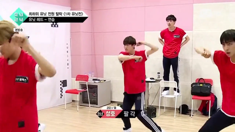 The members are all watching Won repeating the choreography alone