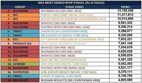 - I don't want to nitpick but doesn't Black pink only get that many views because they only chose to appear on Inkigayo?? All the other idols on the list went to Inkigayo, MusicBank, Show champion, Mcountdown, so their views are all spread out