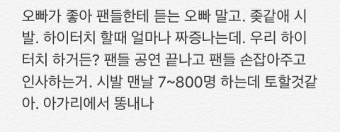 "I hate hearing fans saying that "oppa I like you" using "oppa" They sound like f*ckers f*ck. Do you know how annoyed I am doing High touch? When we do our high touch? Once I finish the concerts I have to do that, I have to grab their hands and greet them. F*ck everyday I need to do that over 700~800 times I feel like throwing up. Their breaths smell like sh*t"