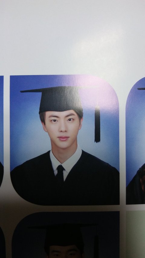 - You know what amazes me the most of Jin? I thought that Jin would get in Konkuk university through celebrities treatment but he passed the exam by himself. It's once he was already in university that he got cast by Bighitㅋㅋㅋ Because he attends class well, he was able to graduate and it's cool seeing him like that. He just looks like an average person. On V app you could see him tell his classmates to send him their graduation pictures and to call him often