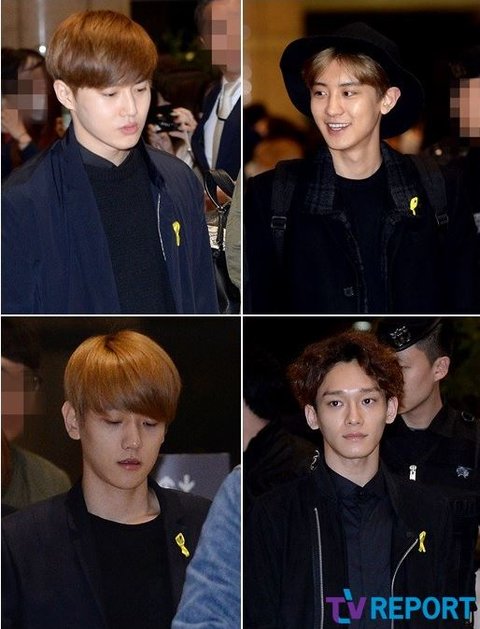 Exo members wearing the yellow ribbon, they also had a sympathetic expression