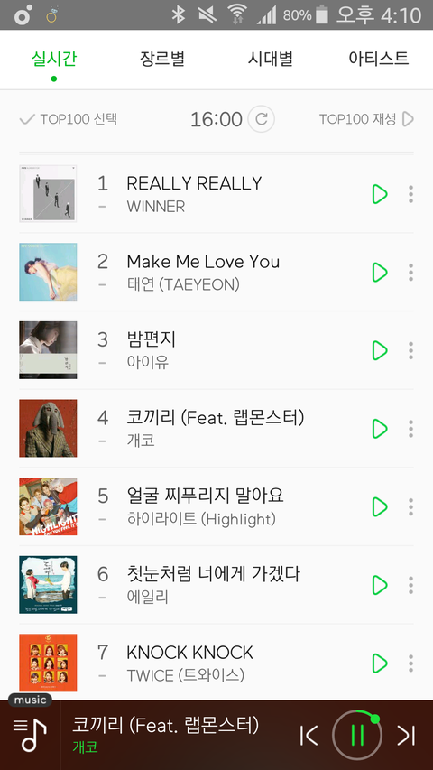 Winner, Gaeko, Taeyeon, Ailee, IU, Highlight, Twice... And the other artists in the top15 right now are Twice, Crush, Jungkey, Hwee-in, Bolbbalgan4, Akmu, Maktub, Goo Yoonhee, etc.