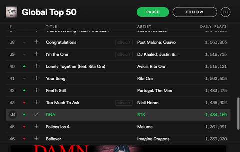 Right now, BTS are top 44 on Spotify's global ranking!