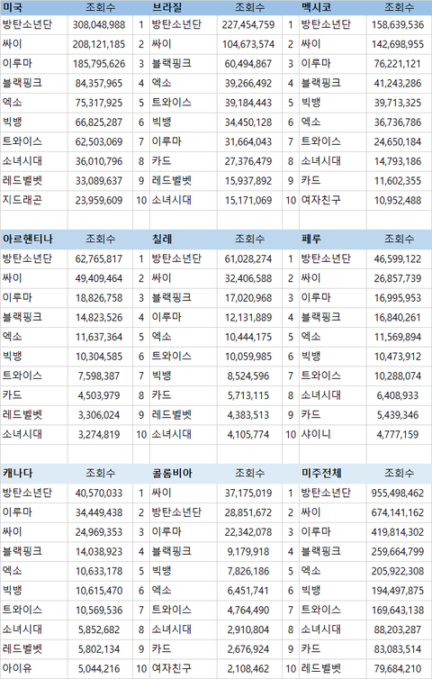Columbia: 1. Psy 2. BTS 3. Yiuma 4. BTS 5. Bigbang