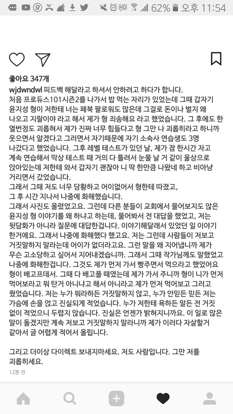 "You asked for feedback. I wasn't going to but here it is. There was a time we ate together for the first time during 'Produce 101 season 2'. There, Yoon Ji Sung hyung suddenly called me over and said, 'You have a lot of followers on Facebook. You should make money with that. Why the hell are you here?' So I replied, 'I'm sorry, hyung.' After that, he kept bothering me about 10 times so I told him that he's really making it hard for me and to stop bullying me. He smiled and said 'okay', and then told me three trainees in his agency had left because of him. Then on the day when we had the level test, I only slept for an hour due to ongoing practice and messed up almost entirely during the actual test so I was sitting down with a frown on my face, and he came over and teasingly said, 'You just did your worth.' I was so startled and in disbelief (at his rudeness) so I talked back to him. But after some time, we made up and that's why I uploaded the photo (selca)".