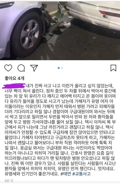 "I really didn't want to post something like this after an accident but I just have to because I'm so angry. She rammed into two cars at a stop. The windows of the car in the middle all shattered, the airbags busted, and all the glass pieces pierced into our bodies and clothes but just because the driver is a famous female idol, they were telling the other victims to wait and trying to take her to the hospital first. The police and the emergency crew were asking if we needed to go to the hospital when our cars have been totaled by getting hit and pushed from the behind. The taxi driver was spilling blood from his neck but they were saying it's okay, it's just a scratch. When I asked if the taxi driver could sit in the emergency truck for a bit to calm himself, they wouldn't allow him because the driver (Taeyeon) had to get in the emergency truck. The driver (Taeyeon) came out and asked if we were okay. She then patted our backs as if she's cheering up her servants. In the emergency room, one of the emergency crew members was giggling, saying we should take pictures. One of the nurses said the roads must be slippery nowadays and asked if the driver of the last car (Taeyeon) came to the hospital or not. What the hell? The people who are supposed to be saving lives were giggling and laughing in front of the patients, and taking care of a celebrity first. How cool. I guess fame and popularity are good after all. #Taeyeon #carcrash