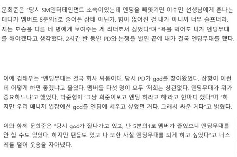 Moon HeeJun (HOT) "I was still in SM entertainment back then, if we lost our spot for the ending stage, Lee Sooman professor would scold us and even if it meant cutting down one fifth of the members. I knew that I had no power so I was so sad. I hated the fact that the other 4 members could see me lose as a leader. I thought that even if I got sworn at, I had to do the ending stage no matter what. For 2 hours and a half, I argued with the PD and at the end, I was finally able to perform the ending stage"