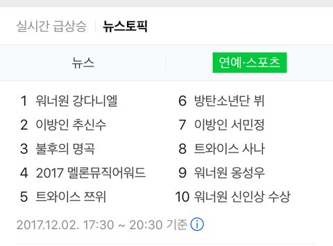 1. Kang Daniel 5. Tzuyu 6. V 8. Sana 9. Ong Seongwu 10. Wanna one rookie award