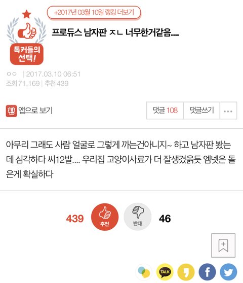 "People might say "it's wrong to diss people based on their appearance~" but after watching Produce 101, it was so f*cking severe.... The cat food at my house looks more handsome than them"