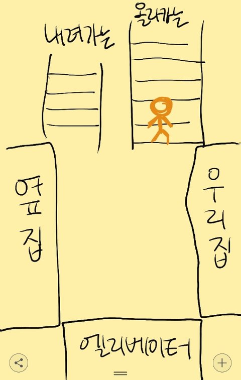 (T/N: it’s written “way to go down” on the stairs at the left and “way to go up” on the stairs at the right. The rectangle on the left is “neighbor” and on the right is “our house”. The lower rectangle is the “elevator”)