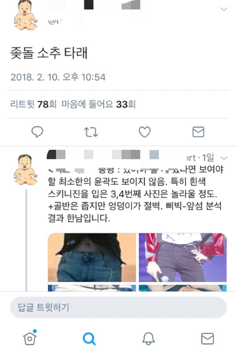 This account is spreading zoomed-in pictures of uncomfortable body parts of various male groups (Bangtan, EXO, Astro, Bigbang, Wanna One, Seventeen, etc.), the sexual harassment is too severe.