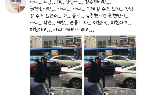 "No...Why do I see Jonghyun and Hyunbin at Gangnam now.... no..no... Yeah you guys can be together of course... You can go to Gangnam... Why..Jonghyun and Kwon Hyunbin... No... This is too much... I'm crying this is crazy... I'm going crazy....Sorry Sorry and Never"