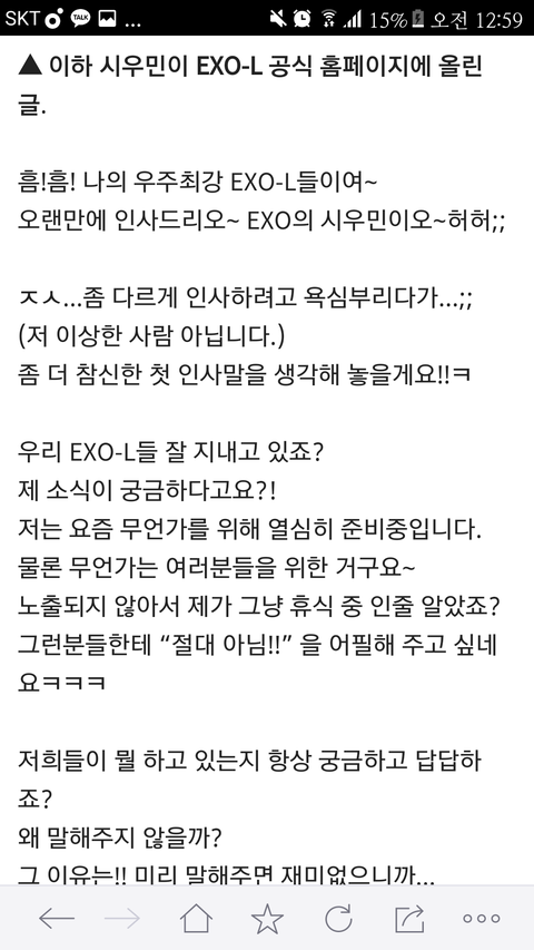 I came to this conclusion after careful consideration, thinking of how I should say this to you without upsetting you guys! Since you're any one else, you're EXO-L, I just thought of speaking honestly. After that words came out smoothly but if there's anyone who feels unhappy or offended by my honesty, I'm truly sorry ㅠㅠ