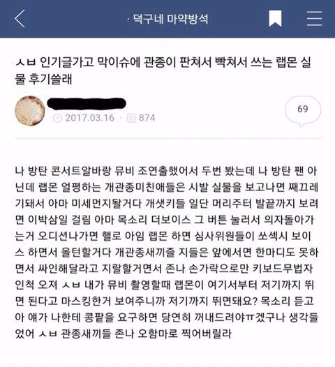 “I had to supervise BTS’ concert and MV so I saw them twice. I’m not a fan of Bangtan but to all the attention seeking f*ckers who swear at Rapmon’s face f*ck, if you see him in real life, you f*ckers will just turn into fine dust. First of all, it will take you 2 nights and 3 days in order to see him completely from head to toe. And his voice is worthy to appear on The Voice and make the judges turn their chairs. He would just need to go there and say “hello I’m Rapmon” and all the judges would go “so sexy voice (T/N: written in English)” and would all turn back. As for the audience, these brats would all become speechless at his voice and would make a fuss to get his signature on the spot. F*ck, when they were filming their MV, I told him to run from one end to the other to show the masking (?) and he was like “I have to run there”? When I heard his voice, ah… I thought, if ever he asked me for a kidney, I would of course take it out for himㅠ f*ck, he would crush all those attention seekers like a hammer”