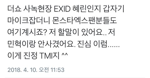 EXID Hyerin suddenly grabbed the microphone during The Show's filming site and said "Monsta X's fans must be present too right? I have something to say.. I'm not dating Minhyuk. This is seriously.. It's very TMI right ^^"