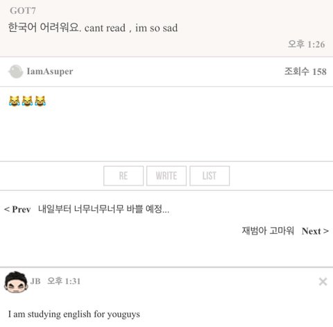 JB: Thank you~ It must be hard (to study Korean) find strength!