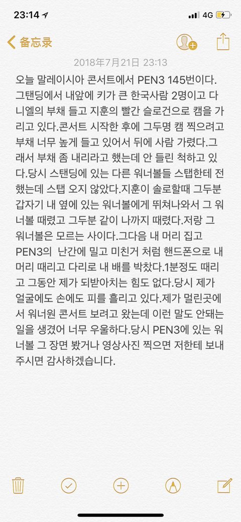 "I went to the Malaysia concert and was in the PEN3 area #145. There was 2 tall Korean people standing in front of me in the standing area, they were holding a Daniel fan and the other was holding a Jihoon red slogan. Shortly after the concert has started, those 2 people were trying to take pictures so they were holding their fan and their slogan really high, so all the people standing behind were hidden. When Jihoon was doing his solo, those 2 people suddenly started jumping on the Wannable who were standing in front of them. They hit on that Wannable and they even hit me too. I don't know the Wannable who was getting hurt. They also scratched my head, and they were pushing me outside of PEN3 while hitting me with their cellphones like crazy. They hit my head and they kicked my stomach. They hit me for a whole minute and I didn't even have any strength to fight back. I came from very far in order to attend Wanna One's concert, and I'm so distressed that such a senseless event happened to me. If there are any Wannable standing in PEN3 at that time and took a video, please send it to me, Thank you. "