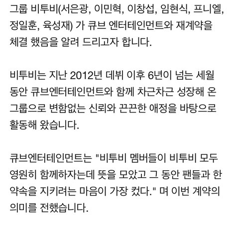 “Group BtoB (Seo Eunkwang, Lee Minhyuk, Lee Changsub, Im Hyunsik, Peniel, Jung Ilhoon, Yook Sungjae) renewed their contract with CUBE Entertainment.”