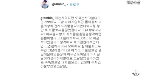 "You’ve committed a crime and it seems like you want to run away. It seems like you don’t intend to apologize at all for the scars you gave me physically and emotionally that day, hyung. You’re the only one I unfollowed, hyung, and you ask me why? Because it gave me chills to think of you uploading comments like nothing happened. I think that you’re reading this. If I look okay to you, that’s a huge mistake. Every time I lie down at night with the lights off, I think of that day. The scars I see on my face in the mirror, don’t think that they were nothing or belong in the past. I can never forget that day. The day when my blood fell in drops like rain and I crouched on the floor crying."