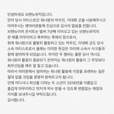 In the same manner, we would like to clarify to everyone that they will not be inconveniencing Wanna One's promotions because of this. We hope that those 2 boys who are doing their best everywhere they go will continue to have fun and coolly receive the cheers of everyone without changing for the rest of 2018, and we hope they will keep receiving support (t/n: that was heck of a long sentence;;;).