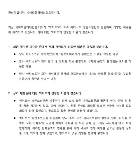 “Big Hit will take the following steps in order to resolve these issues: first, we are contacting the atomic bomb victim associations in Japan and Korea to explain and apologize for the problems that have been raised. We have also sent a letter explaining and apologizing for the situation to the Simon Wiesenthal Center [a Jewish human rights group].”