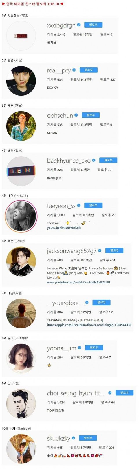 [enter-talk] TOP 10 IDOLS WITH THE MOST FOLLOWERS ON INSTAGRAM Posted on November 21, 2018 (in millions) Bigbang, EXO and SNSD are gods post response: [+141][-13] original post: here ㅇㅇ |2018.11.21 17:46 신고하기 BP's Lisa has 10M followers and Jennie has 9M 추천53 반대8 ㅇㅇ |2018.11.21 17:43 신고하기 GD ㄷㄷ 추천40 반대2 ㅇㅇ |2018.11.21 19:17 신고하기 But now, Lisa and Jennie should be there too. One has 10M and the other has 9.8M 추천39 반대11 ㅇㅇ |2018.11.21 18:48 신고하기 This needs to be updated though. Chanyeol now has 15.7M, Sehun has 14.6M and Baekhyun has 13.6M.. I looked up Lisa's Instagram just by chance and she already passed 10Mㄷㄷ 추천37 반대2 ㅇㅇ |2018.11.21 18:44 신고하기 EXO is almost all at the top 추천24 반대1 ㅇㅇ |2018.11.21 22:43 신고하기 Isn't GD the first in Asia? 이미지확대보기 추천23 반대1 Email ThisBlogThis!Share to XShare to Facebook