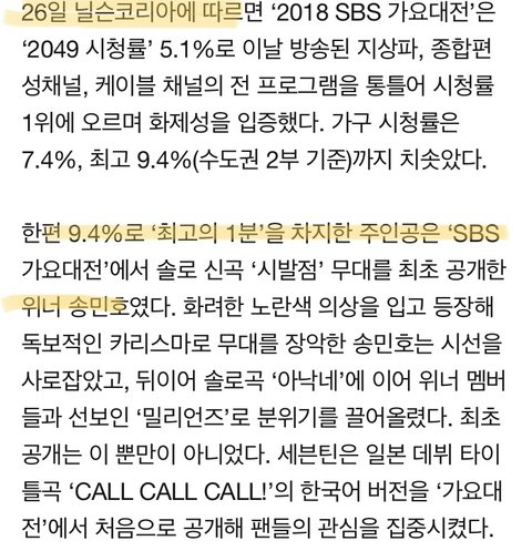 - If you look at BTS, their views were higher, but BTS' rating comes from TNMS, while Song Mino comes from Nielsen. All main portals for TV programs use Nielsen as a standard, so that's why it's fact that Song Mino was #1 for Gayo Daejun