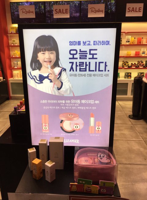 - What kind of crazy mom would ask their kid "you want to try putting on makeup~?" and buy it?... people who are promoting this isn't trying to make their parents recommend their kids to wear makeup. Instead, their kids probably already bought cheap makeup and despite the parents telling them not to wear it, they can't come to their senses, that's why the parents will end up buying those. It's so easy to search up "kid makeup" on YouTube nowadays, so the kids who don't know better are already putting on makeup by themselves ㅇㅇ So the parents who watch their kid being like that just sigh and buy them makeup. Our society is just using this situation as a marketing strategyㅇㅇ